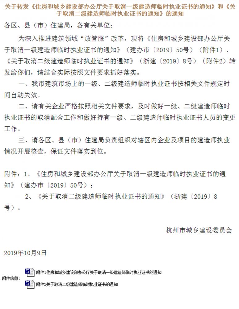 關于轉發《住房和城鄉建設部辦公廳關于取消一級建造師臨時執業證書的通知》和《關于取消二級建造師臨時執業證書的通知》的通知