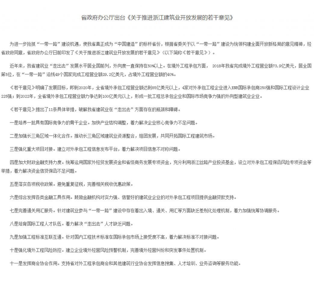 省政府辦公廳出臺《關于推進浙江建筑業開放發展的若干意見》